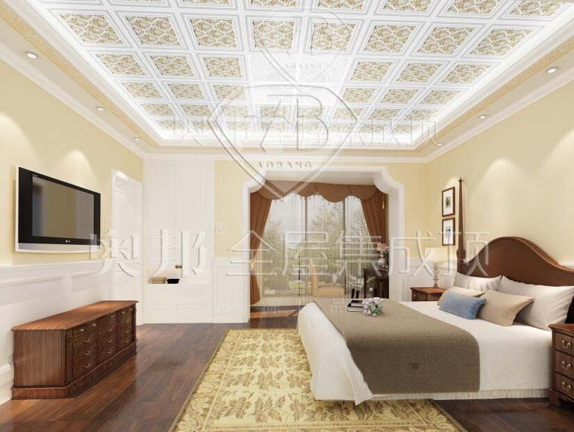 白色,是一種包含了光譜中所有顏色光的顏色,明度較高,因此不僅能與各色系搭配,同時也容易與其它色調(diào)形成強(qiáng)烈的比對。白底金格的整體布局,加上金色花紋走邊,一掃簡約風(fēng)格帶來的空寂之感,卻傳來一股雅靜的味道。暗色花紋的吊桿上掛上水滴狀的小燈組合成一臺流光溢彩的臥室掛燈,與吊頂周邊的燈帶光遙相呼應(yīng)。